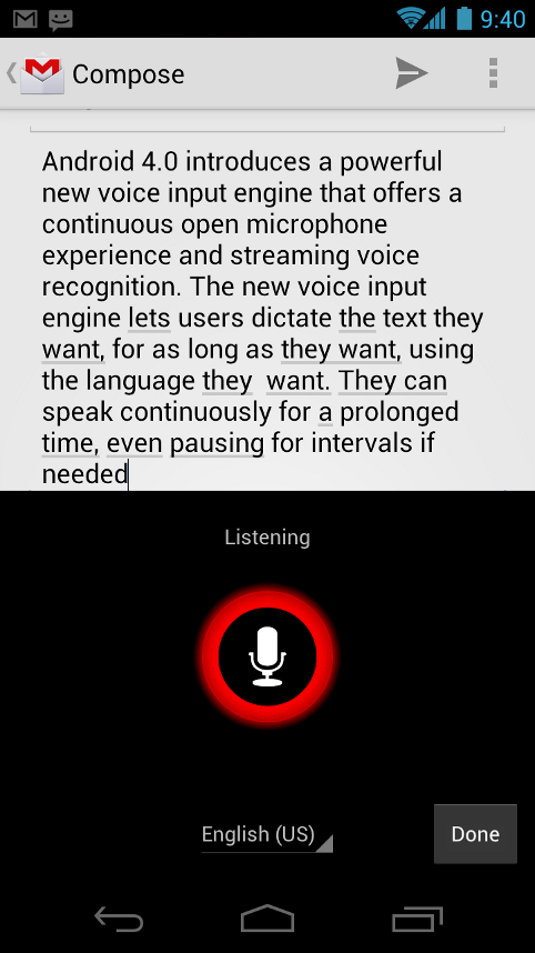 Android 4.0 introduces a powerful new voice input engine that offers a continuous "open microphone" experience and streaming voice recognition. The new voice input engine lets users dictate the text they want, for as long as they want, using the language they want. Users can speak continuously for a prolonged time, even pausing for intervals if needed, and dictate punctuation to create correct sentences. As the voice input engine enters text, it underlines possible dictation errors in gray. After dictating, users can tap the underlined words to quickly replace them from a list of suggestions.