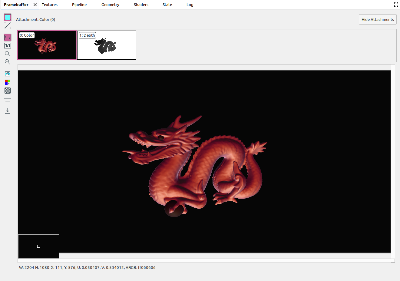 A framebuffer can contain multiple attachments. You can select which attachment to display and click Show Attachments or Hide Attachments as needed. Attachment thumbnails are labeled with the type of the attachment (for example, COLOR, DEPTH, and INPUT) as well as its index.