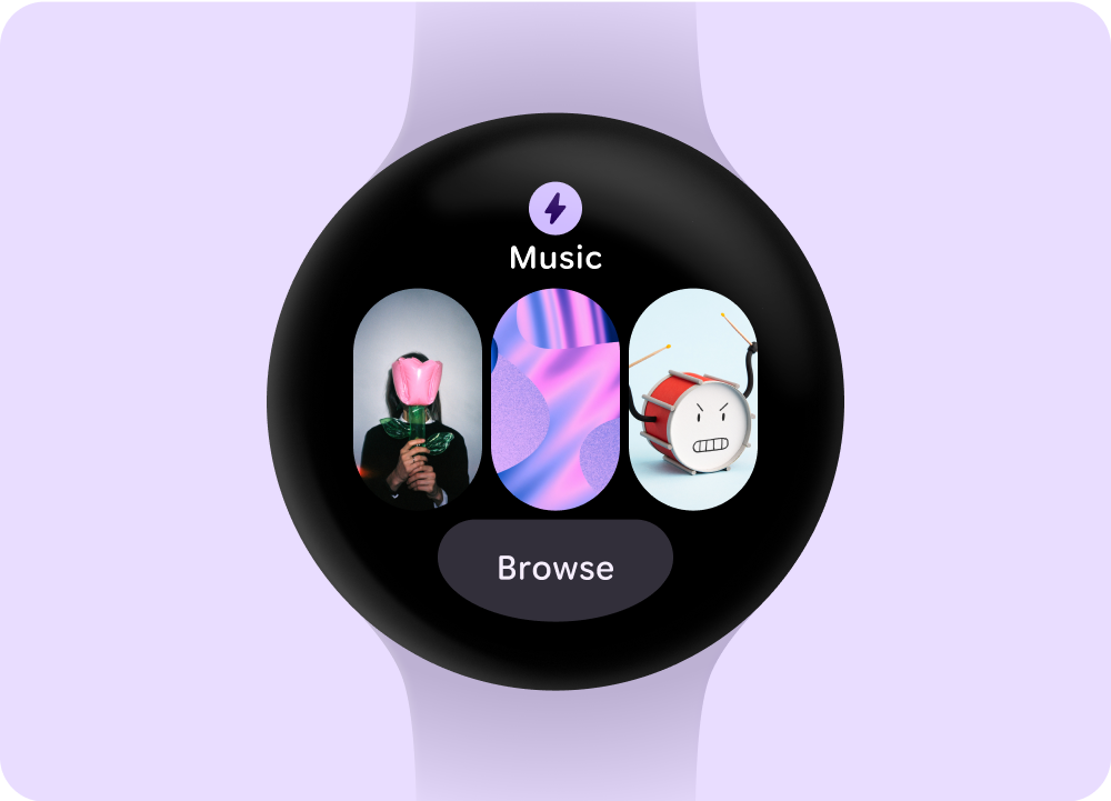 Reduce your app hierarchy and expose media for the user. Design with a flat information architecture that allows users to quickly access lists and showcase thumbnails. Consider using custom design components for Wear OS.