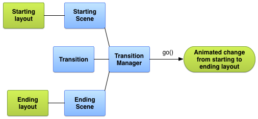 You typically apply a transition to change between different view hierarchies in response to an event, such as a user action. For example, consider a search app: when the user enters a search term and taps the search button, the app changes to a scene that represents the results layout while applying a transition that fades out the search button and fades in the search results.