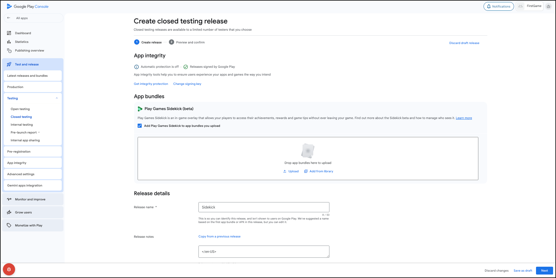 Create an internal or closed testing release in Play Console to test pre-release versions of your game with Sidekick and gather targeted feedback.