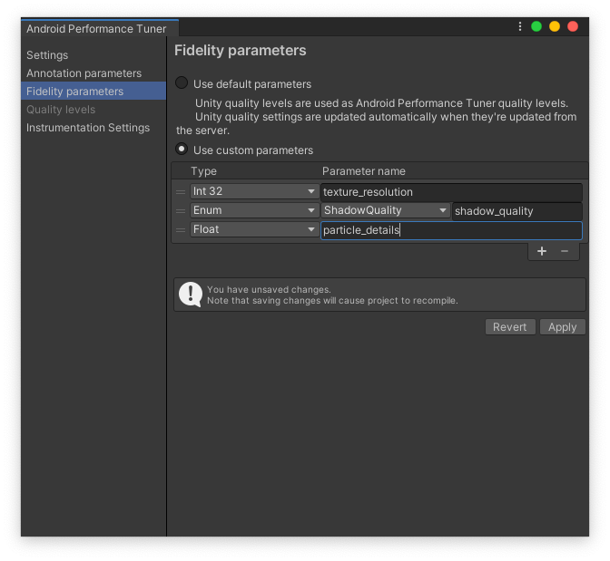 These parameters can be regrouped into quality levels (for example "low", "medium", and "high"). To have these parameters properly reported by Android Performance Tuner, and then analyzed and visualized in the Google Play Console, you must expose the parameters to the plugin. Add your fidelity parameters in the Fidelity parameters tab.