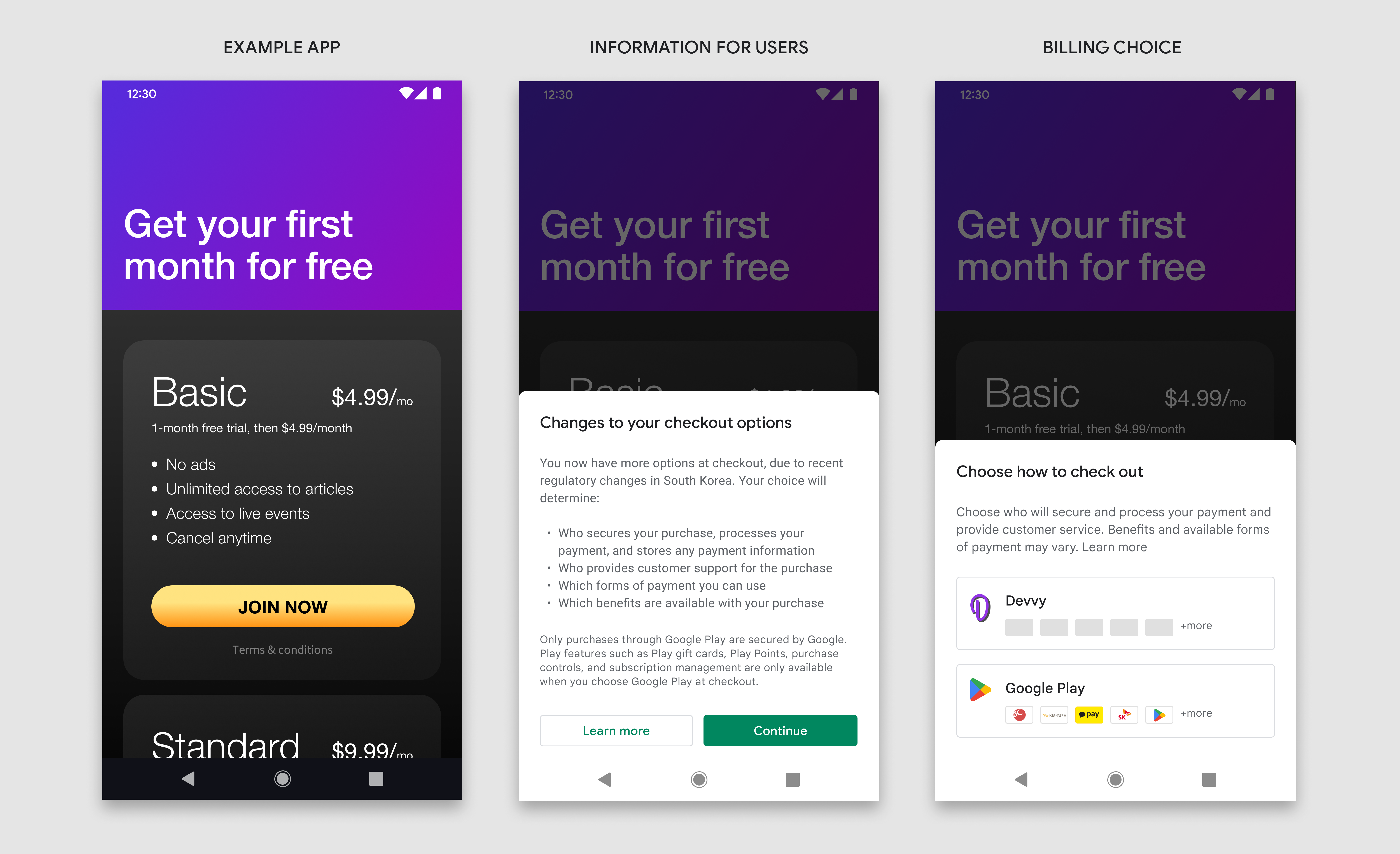 In order to maintain a consistent user experience and to help users make an informed choice, you are required to display an information screen and a separate billing choice screen if you offer an alternative in-app billing system to Google Play’s. The information screen only needs to be shown to each user the first time the user initiates a purchase, while the billing choice screen should be shown before every purchase. The user-facing messages and UI specifications for both screens should be implemented according to the following guidelines.
