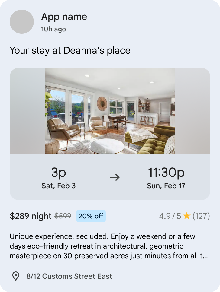• Recommendation clusters show personalized travel & event suggestions from an individual developer partner. These recommendations can be personalized to the user or generalized (for example, trending items). Use these to surface articles, events, lodging, or places of interest recommendations.