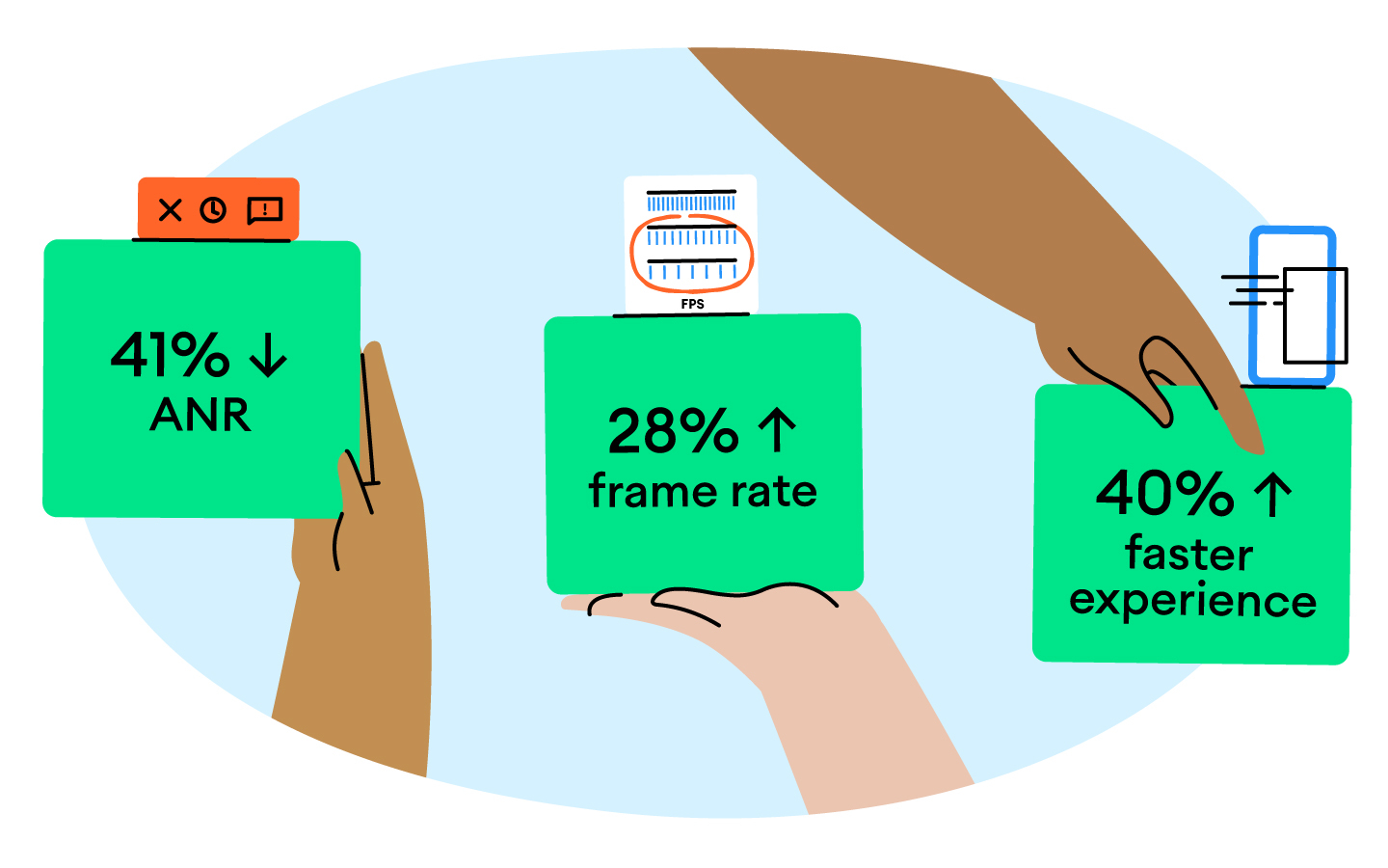 Hands holding notes reading 41% less ANRs, 28% improved frame rate and 40% faster experience.