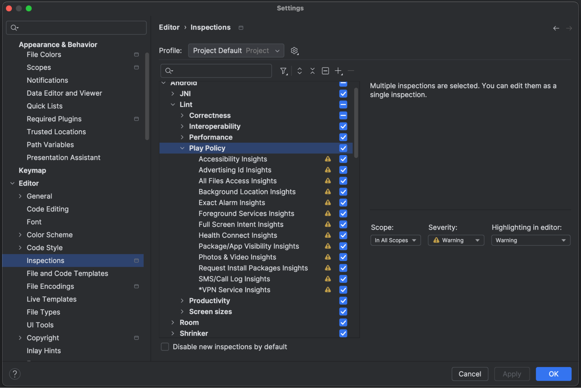 You can disable lint checks for the Play Policy Insights feature by unchecking them in the default inspection profile. To do this, navigate to File > Settings > Editor > Inspections (on Windows/Linux) or Android Studio > Settings > Editor > Inspections (on macOS). From there, you can disable individual Play Policy Insights checks under Android > Lint > Play Policy.